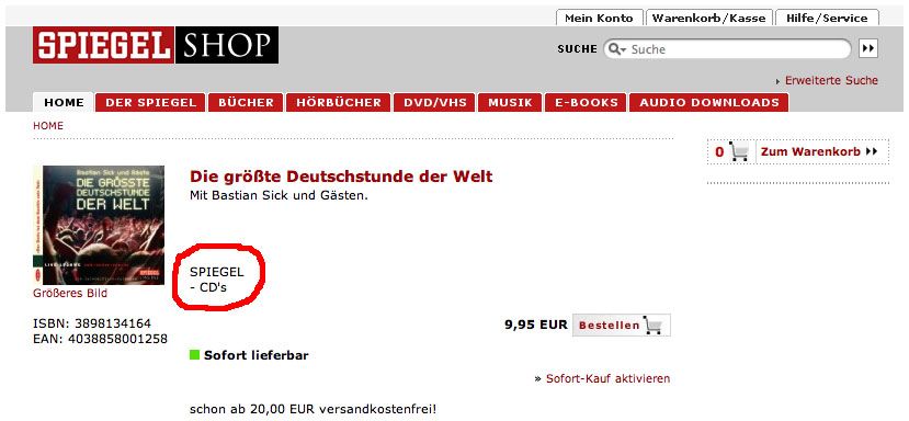 Da veröffentlicht SpOn die Zwiebelfisch-Kolumne des Herrn Sick, macht Reklame für seine Tour, veranstaltet Deutschtests, sieht sich als Hüter und Wahrer der deutschen Sprache und dann … ein Deppenapostroph im hauseigenen Online-Shop.